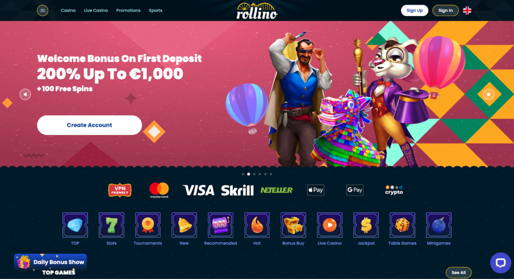 Rollino launched in 2023 as a modern casino delivering the perfect mix of crypto and fiat payment methods for slot enthusiasts. The platform partners with 85-100+ developers to provide thousands of slot games across all categories including Megaways, bonus buy, jackpots, high volatility, and classic titles. Rollino really shines in payment flexibility by accepting six cryptocurrencies plus comprehensive fiat options like cards, e-wallets (Skrill, Neteller, MiFinity), and bank transfers in nine different currencies. The four-part welcome package delivers up to €6,000 plus 425 free spins created specifically for slot players. Weekly cashback up to 25% and regular slot tournaments add ongoing rewards for loyal players through the six-tier VIP program.